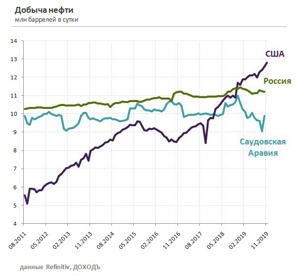 Добыча нефти в США продолжает обновлять исторические максимумы. Показатель находится на уровне 12,8 млн баррелей в сутки, хотя еще 7 лет назад составлял 5,5 млн баррелей.