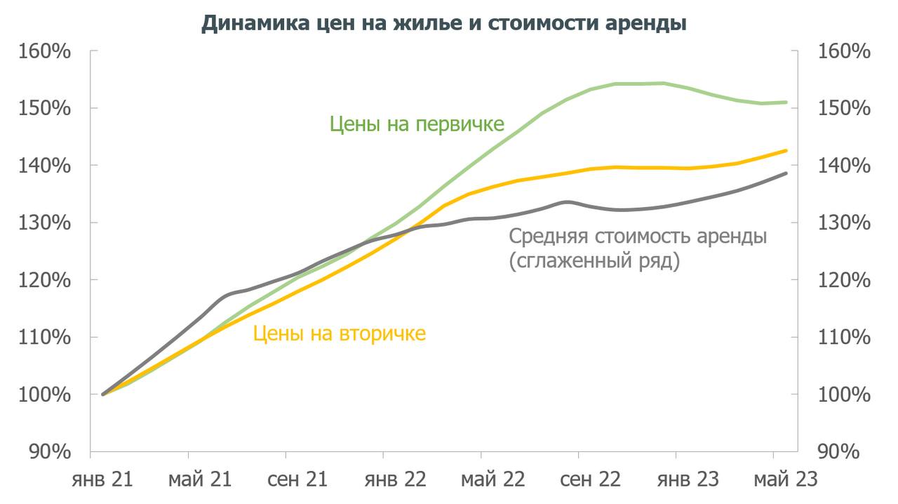 А это позволяет нам проанализировать много интересных вещей – например, сравнить изменения стоимости аренды и цен на жилье и с другого угла обсудить «фундаментальность» и «естественность» роста цен в 2020-2022 годах.