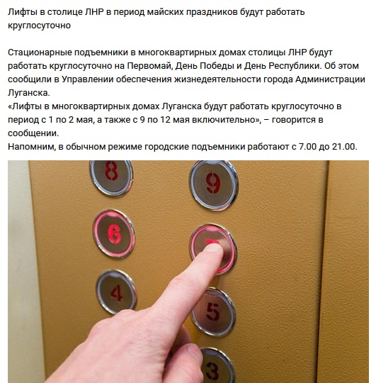Новость о процветании – лифты в Луганске в период майских праздников будут работать круглосуточно