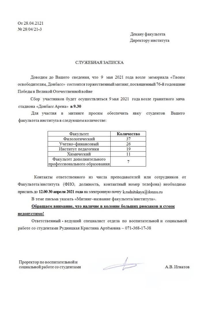 Как выяснилось, работников бюджетной сферы и студентов заставляют явиться на мероприятия, посвященные празднованию Дня Победы и Дня Республики 11 мая. «Служебные записки» разослали по высшим учебным заведениям и некоторым бюджетным учреждениям в Донецке. Так, администрацию Донецкого национального университета руководство просит обеспечить явку преподавателей, сотрудников и студентов» в конкретном количестве на акцию, митинг и шествие.