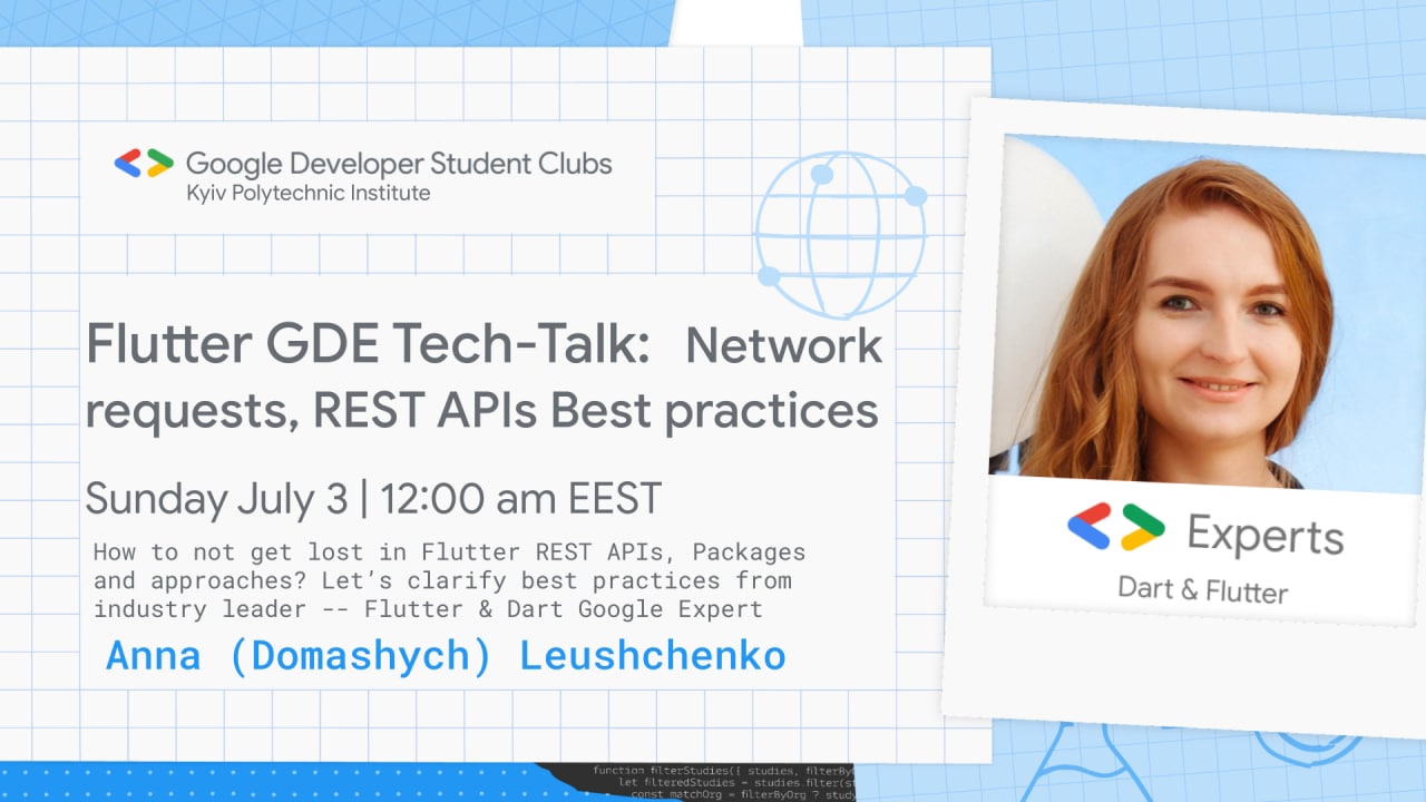 Вже завтра (3 липня) о 12:00 Google Flutter & Dart експерт, амбасадор жінок-викладачів та ентузіастка мобільної розробки Анна Леущенко представить вашій увазі добірку інструментів і підходів, розроблених для полегшення впровадження API з допомогою Flutter і Dart, які вона використовує при роботі у Tide 🔥
