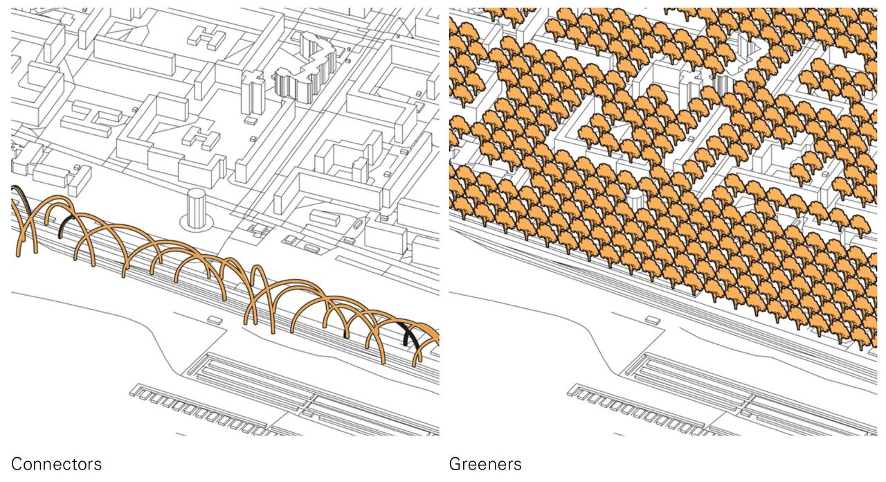 Например, тип под названием Connector выглядит как длинная горизонтальная или гнутая ветка: независимо от наполнения такая постройка может соединять друг с другом разные части города. Объединить берега реки или канала или две стороны широкого проспекта. Green Dipper вовсе не является зданием. Это зелёная зона, которая используется что того, чтобы привнести в городскую среду природные элементы. Tribunes — постройки в виде трибун, из которых с каждого этажа могут открываться виды. Viewers — видовые площадки, держащиеся на тонких опорах, здесь важны не горизонтальные виды, а панорамные, возможность обозревать город со всех сторон. Icons в первую очередь привлекают внимание. Есть и простые типы: башни (Towers) и плиты (Slabs). Они представляют собой объём в чистом виде. Практически каждое подобное вторжение может восполнить тот или иной недостаток среды.