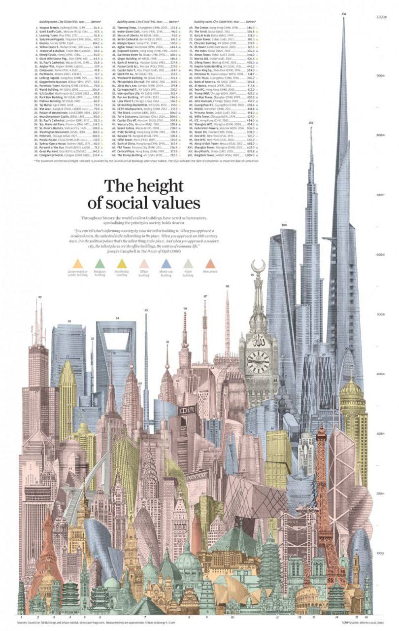 Очень занимательная картинка, где собраны величайшие постройки древности и большинство самых знаковых современных небоскрёбов. Всего 102 здания на одном изображении, что само по себе впечатляюще. Но ещё интереснее наглядное сравнение размеров построек.