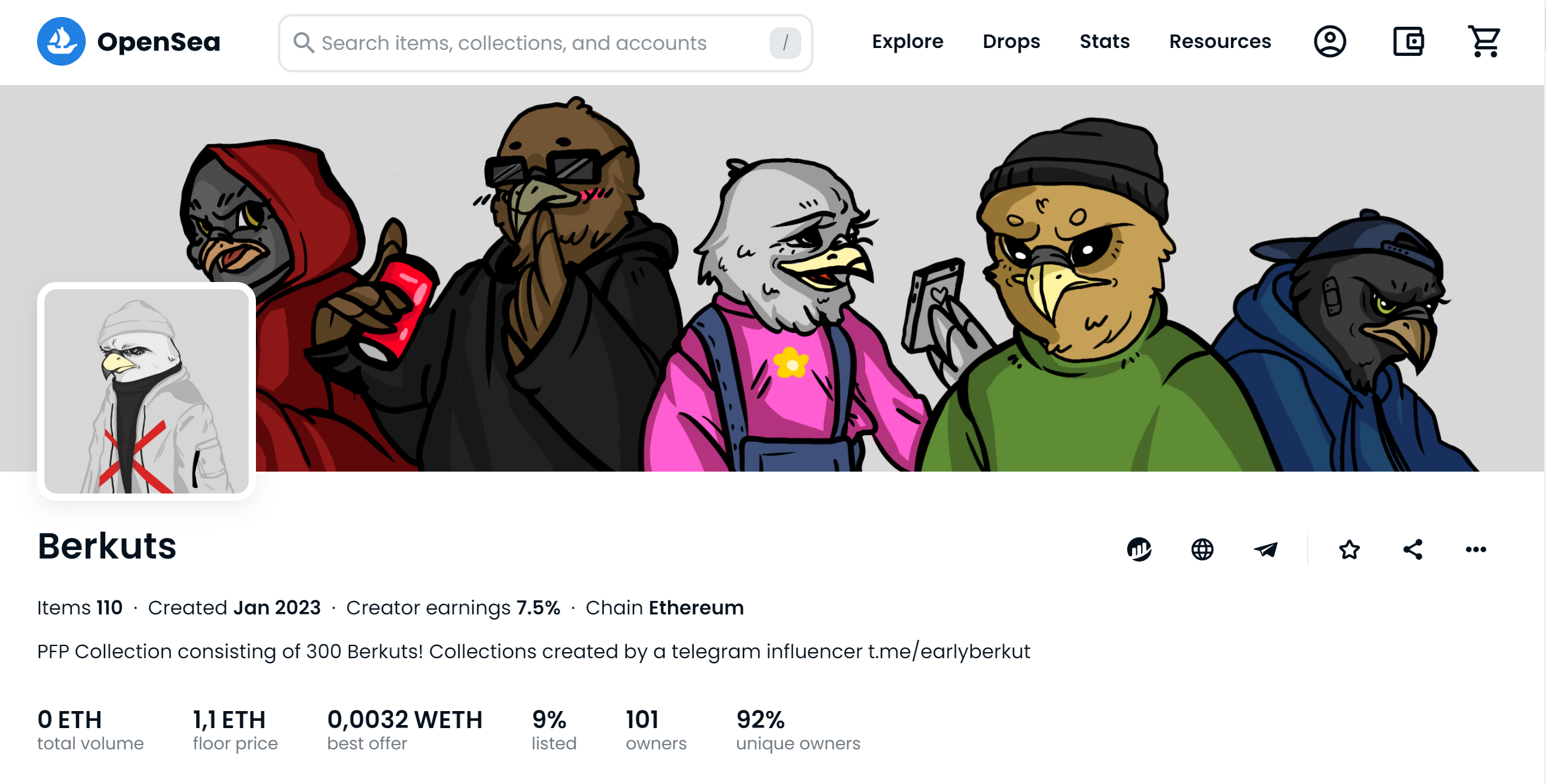 Участники сообщества заминтили более 150 NFT и я создал телеграмм-чат для холдеров Berkuts. Попробую построить небольшое комьюнити доступ к которому будут получать владельцы нфт, которые можно было получить бесплатно, оплатив только газ за транзакцию. Остальную часть саплая я сминтил сам, возможно буду разыгрывать эти нфт или выдавать активным людям, а возможно просто оставлю их на кошельке.