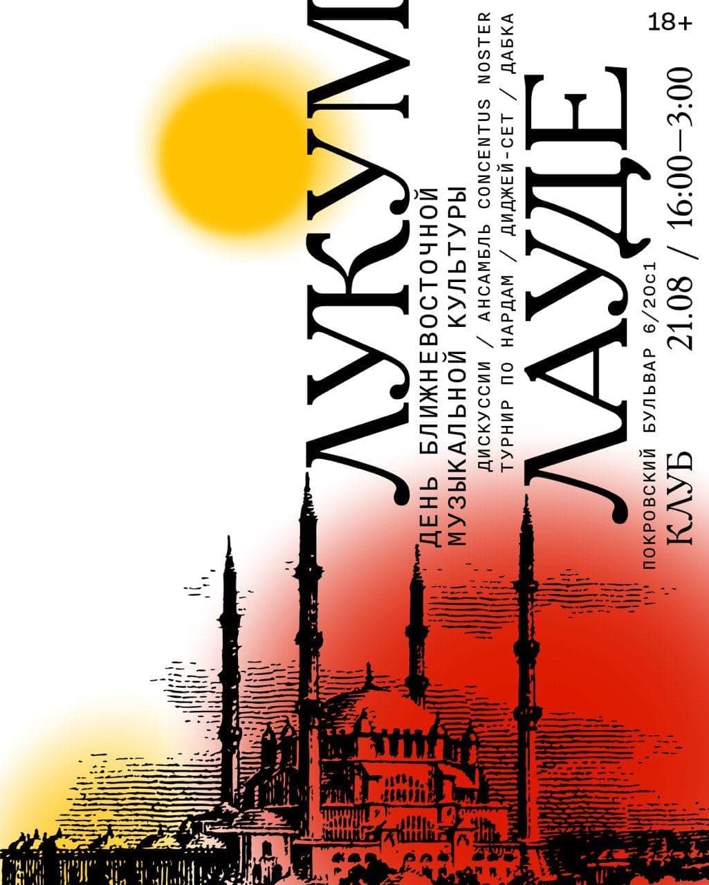 В ближайшую субботу, 21 августа, в московском клубе «Клуб» — «Лукум лауде», большой ивент про ближневосточную музыку, который делают замечательные люди. Всем, кто не поедет на Signal или на дачу, горячо рекомендую. В программе — паблик-токи («Суфийские мотивы в творчестве Меладзе» — неплохой такой претендент на победу), концерт-лекция ансамбля классической восточной музыки CONCENTUS NOSTER, турнир по длинным нардам, ну и танцы-танцы-танцы.