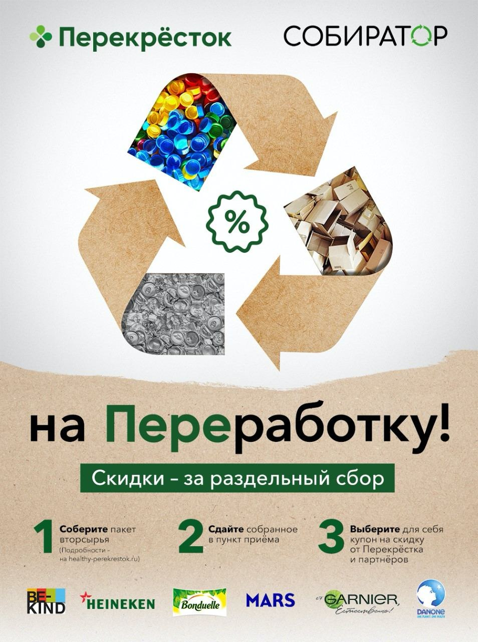 После сдачи вторсырья «Собиратору», вы получите купоны на скидку до 25% на продукты Mars и других партнёров акции. Акция организована сетью супермаркетов «Перекрёсток» и проектом «Собиратор» совместно с Mars, Bonduelle, Danone, Heineken, Garnier и Be-Kind.