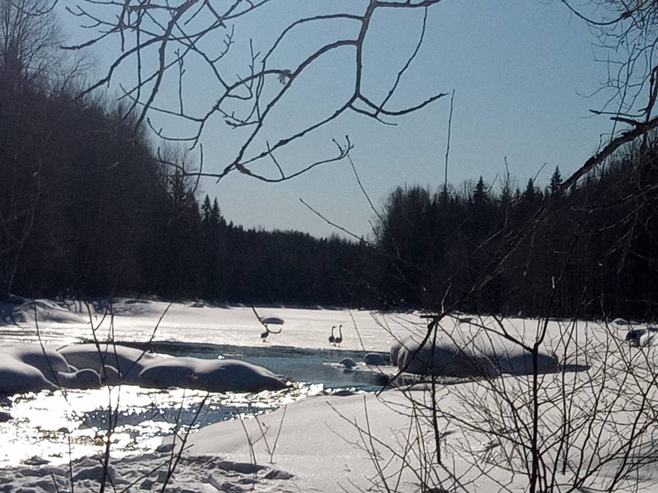 На реке Порженка в Плесецком секторе Кенозерского национального парка старший госинспектор Иван Роймуев заснял трёх лебедей-кликунов, сидящих на льду.