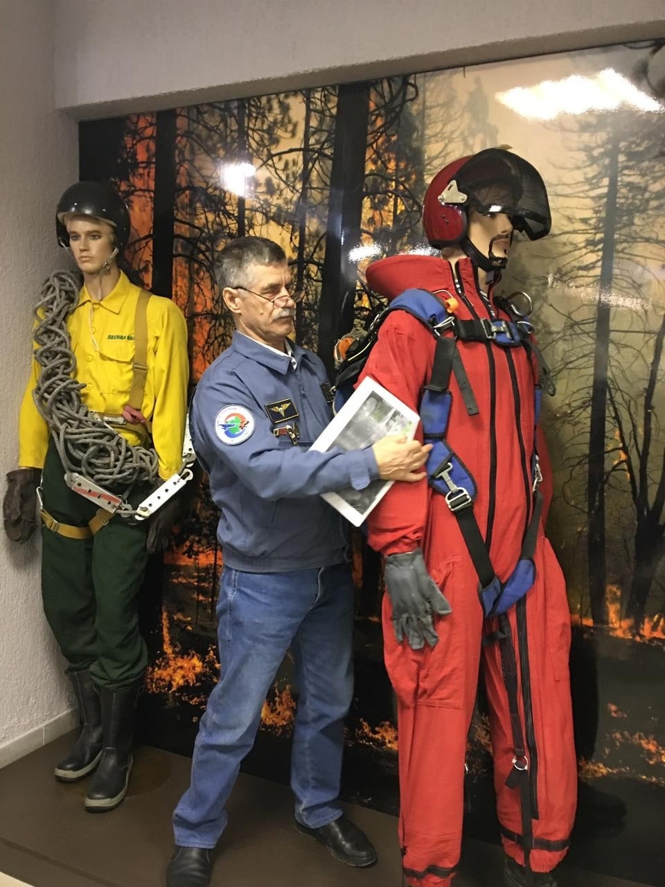 Он продемонстрировал снаряжение парашютиста-пожарного десантника-пожарного, показал средства тушения лесного пожара, которые они берут с собой, рассказал о транспорте и способах доставки парашютистов и десантников-пожарных.