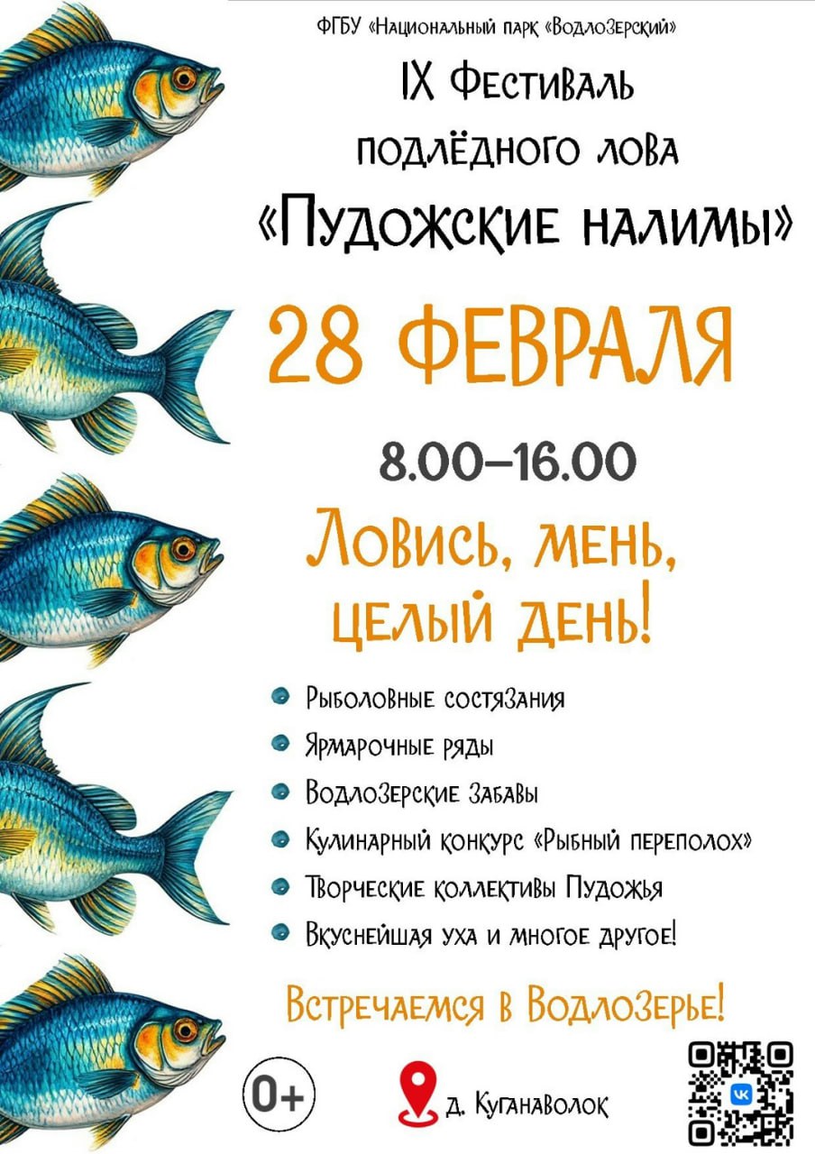 Национальный парк «Водлозерский» (Архангельская область, Карелия) приглашает на главное зимнее событие – рыболовный IX фестиваль «Пудожские налимы». Мероприятие состоится 28 февраля и будет приурочено к 35-летию парка. Девиз фестиваля 2026 года: «Ловись, мень, целый день!»👏👏👏