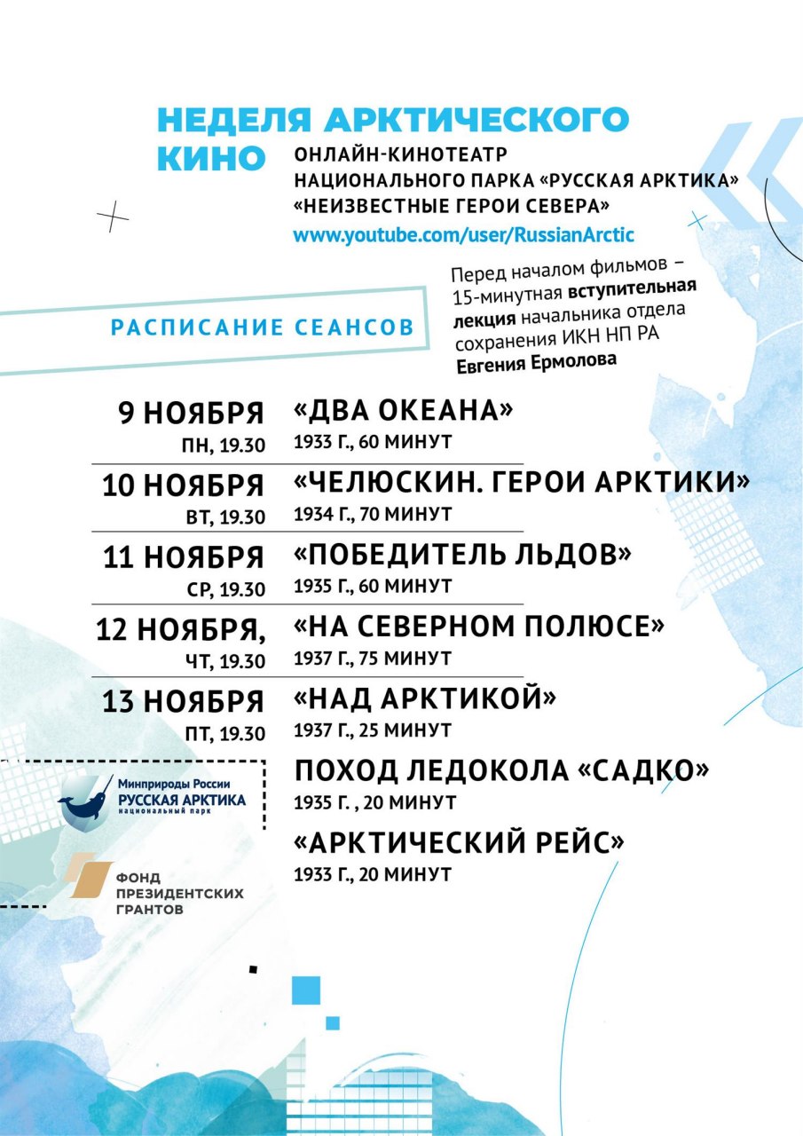 С 9 по 13 ноября каждый вечер в 19.30 на YouTube RussianArctic национального парка «Русская Арктика» можно будет увидеть исключительно редкие фильмы, еще не представленные широкому зрителю. Онлайн-кинотеатр «Неизвестные герои Севера» – совместный проект нацпарка «Русская Арктика» и студии «Позитив-фильм».