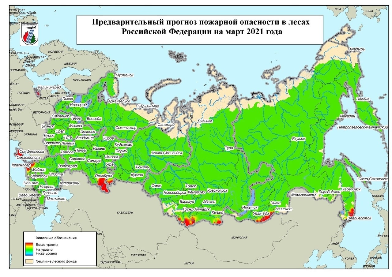 Согласно прогнозам, в марте 2021 года существует вероятность превышения среднемноголетних значений параметров пожарной опасности на всей территории Республики Крым и на западе Краснодарского края. Также в зоне риска будут находиться восточная часть Оренбургской области и Республики Тыва, юг Республики Алтай, Республики Башкортостан и Челябинской области, юго-запад Забайкальского края и юго-восток Приморья.
