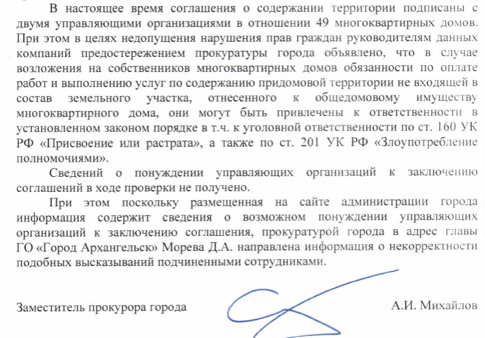 В связи с вышесказанным те две УК, что успели подписать "соглашение" с архгорадмином, получили от прокуратуры предостережение. Так что ждем скорого расторжения договоренностей, ну или посадок.