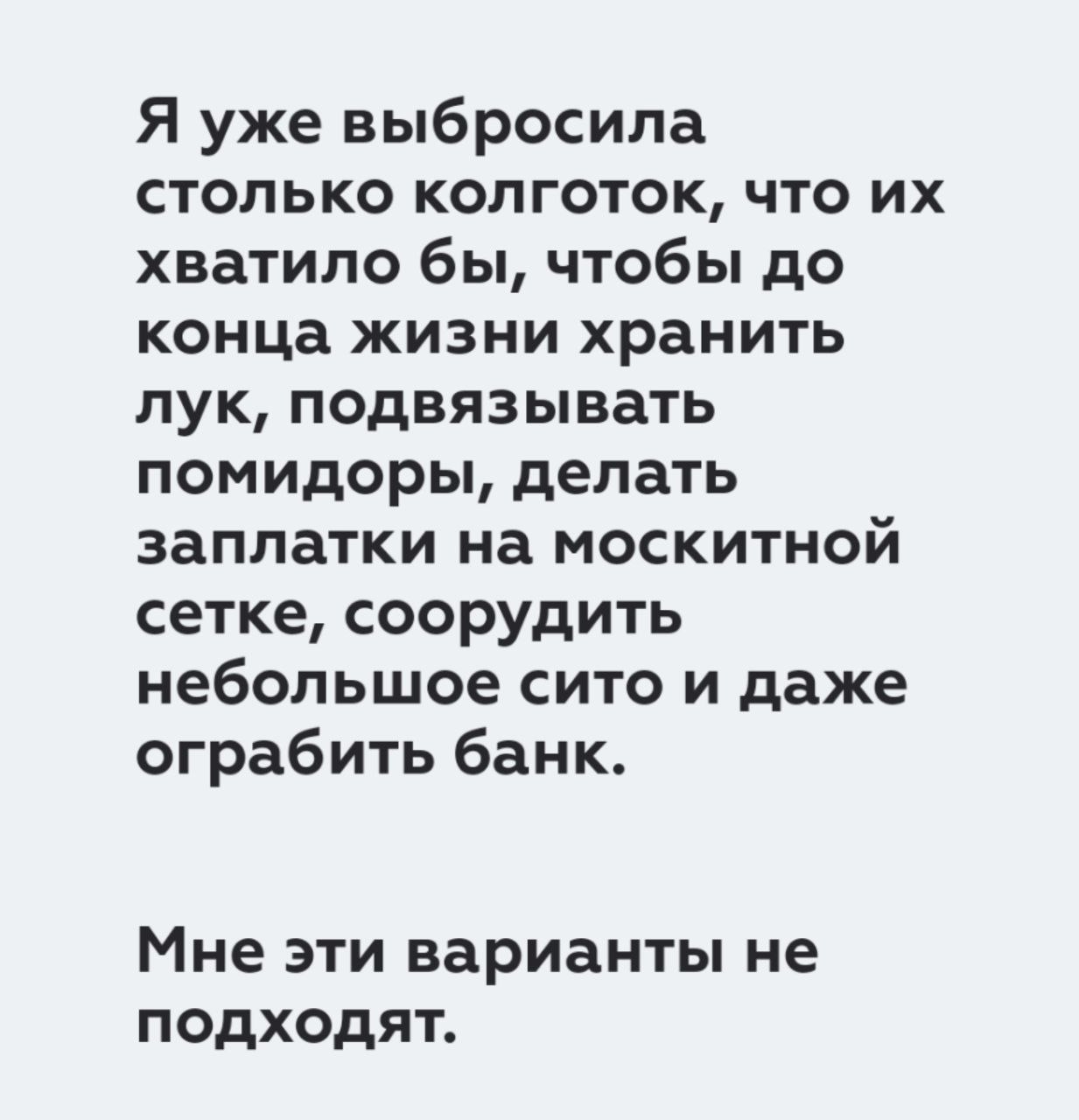 ♻️ Ходит миф (или не миф), что производители уже давно придумали нервущиеся колготки, но им невыгодно выпускать их на рынок, так как этот товар станет крышкой в гроб их прибыли. Меня просто покорила статья одной девушки для "Гринпис", в которой она легко и с юмором рассказывает о масштабах потребления колготок и причинах отсутствия у них "многоразовой" альтернативы.