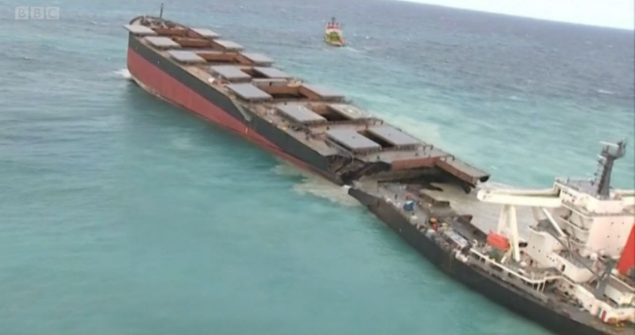 🇲🇺 В Маврикии Японский танкер MV Wakashio развалился в субботу на части, сообщает Национальный кризисный комитет островного государства. В 16:30 в океане была замечена носовая часть судна.
