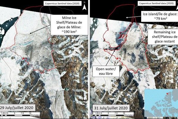 🧊 За два дня, из-за аномально высокой температуры, последний полностью нетронутый ледяной шельф в Канадской Арктике потерял почти половину своей площади. Речь идёт о леднике Милн, который находится на краю острова Элсмир, на малонаселенной северной территории Канады.
