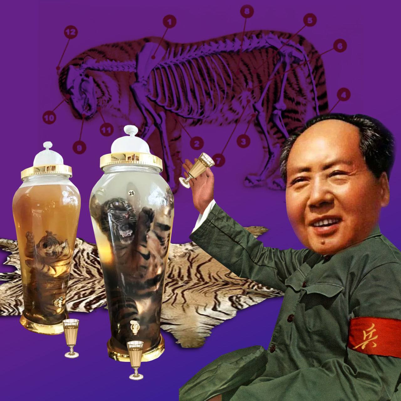 Показателен пример, как несколько лет назад задержали крупнейшую партию дериватов на таможне в Приморье. В мешках контрабандистов были обнаружены шкуры и кости пяти амурских тигров, 867 лап, когти и желчные пузыри бурого и гималайского медведей, хвосты и пенисы изюбра и оленей. Из лап медведей готовят традиционный маньчжурский деликатес. Кости тигра помещают в спиртовой раствор, из которого затем получают «тигровое вино» — очень популярное у мужской части китайцев, стоит более $800 за бутылку. Из-за усиления наказаний в Китае есть основание полагать, что активизируется истребление животных в России, где, по оценкам экспертов, ежегодно от рук браконьеров погибает до 20 тигров.