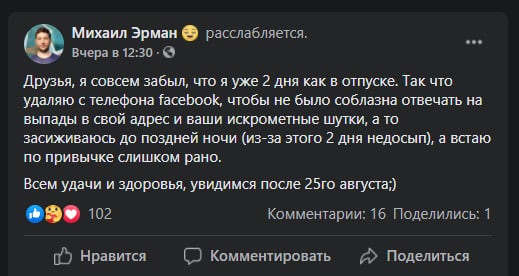 В это же время руководитель венчурной студии МТС удалил приложение Facebook, предварительно оповестив об этом тех, кто смотрит его ленту. Эрман не захотел терпеть в отпуске назойливые уведомления.