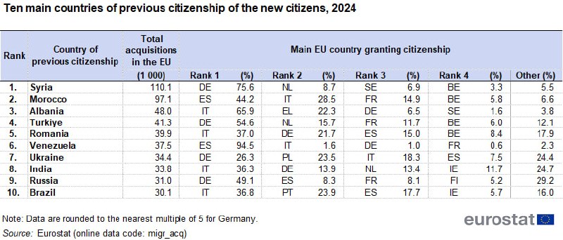 Россияне вошли в ТОП-10 получателей гражданства Евросоюза. По данным Евростата в 2024 г. в ТОП наций, получающих паспорта вошли сирийцы (110 100 человек, 9,3 % от общего числа получивших гражданство), марокканцы (97 100, 8,2 %), албанцы (48 000, 4,1 %), турки (41 300, 3,5 %), румыны (39 900, 3,4 %).