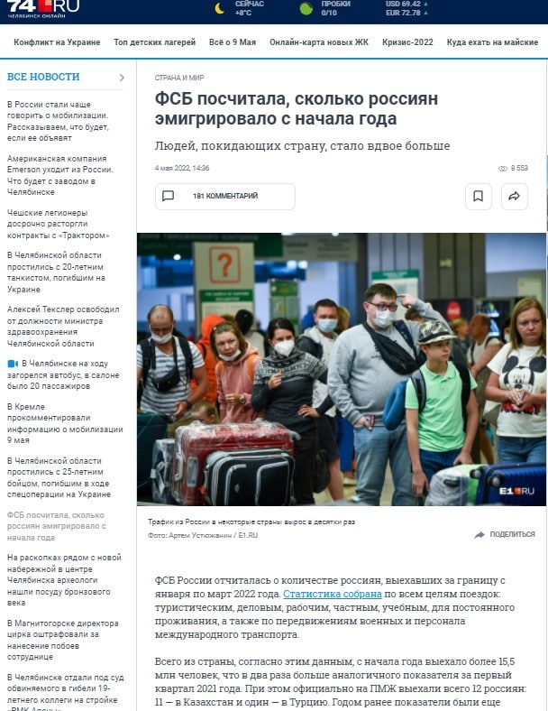 Челябинская пресса настолько сурова, что, кажется, выболтала страшную тайну. Портал 74.ru выпустил материал под названием "ФСБ посчитала, сколько россиян эмигрировало с начала года". Подзаголовок еще страшнее: "Людей, покидающих страну, стало вдвое больше".