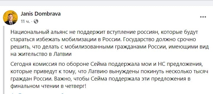 "Государство должно срочно решить, что делать с мобилизованными гражданами России, имеющими вид на жительство в Латвии. Сегодня комиссия по обороне Сейма поддержала мои предложения, которые приведут к тому, что Латвию вынуждены покинуть несколько тысяч граждан России. Важно, чтобы Сейма поддержала эти предложения в финальном чтении в четверг!", - написал он в Facebook.