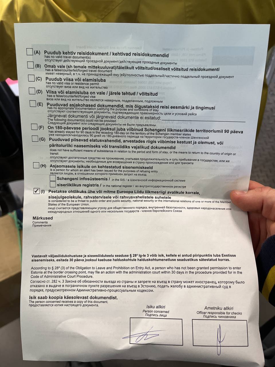 В бумаге, фиксирующей отказ во въезде, указано основание: «Лицо считается представляющим угрозу для общественного порядка, внутренней безопасности, здоровья народонаселения или международных отношений - одного или нескольких государств - членов Европейского Союза".