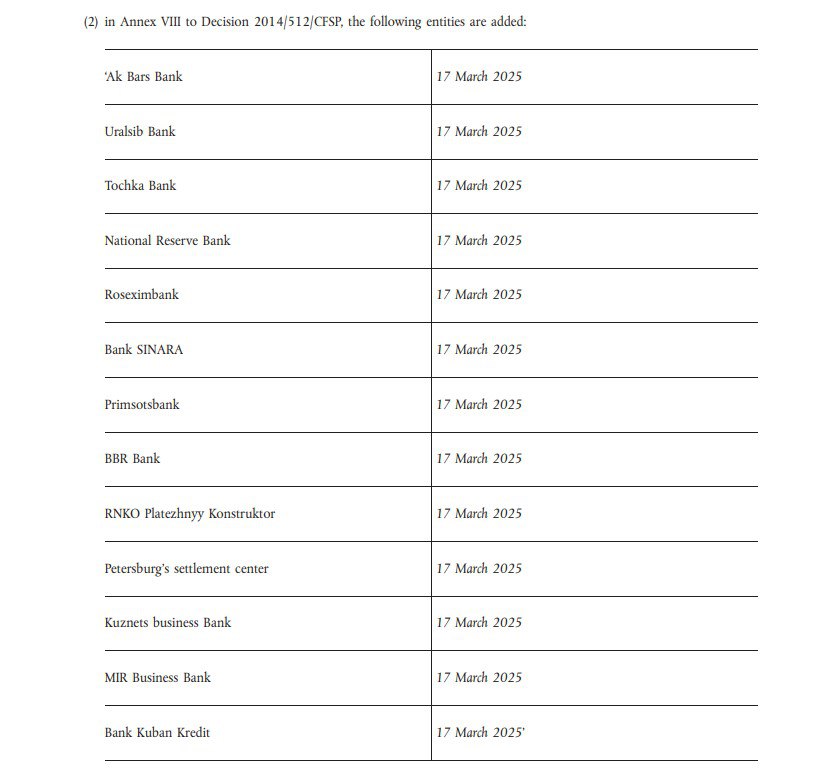 Под санкции, в частности, угодили 13 банков — «Уралсиб», «Ак барс», «Точка банк», банк «Синара», «Примсоцбанк» и другие.