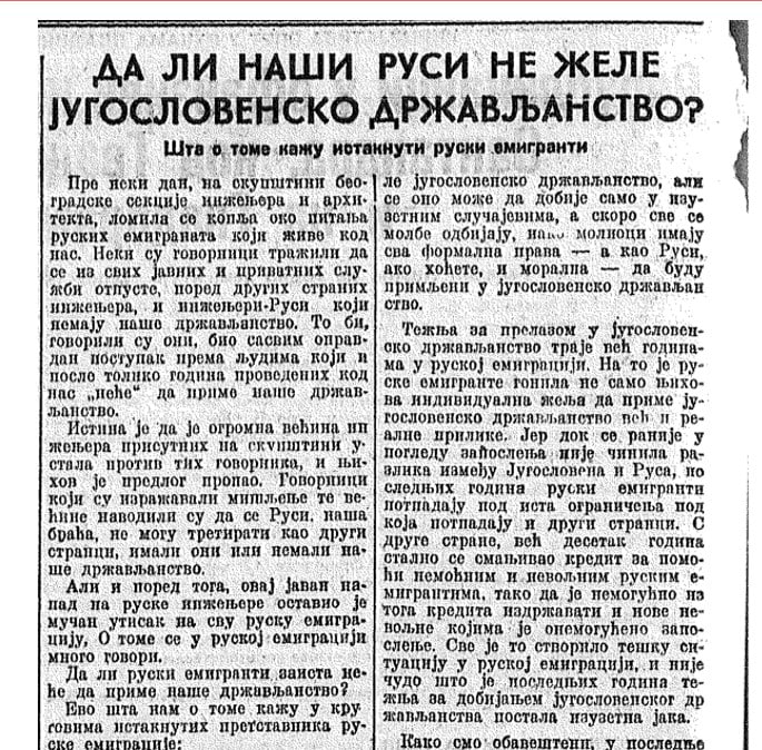 Интеграция белой эмиграции проходила не без проблем. Получить паспорт в тогдашнем Королевстве Югославия было непросто. Но когда сербы все-таки упростили прием в гражданство, выяснилось, что выходцы из России гордились своим подданством и большинство не захотело получать паспорта Югославии. Тогда считалось, что это что-то вроде предательства.