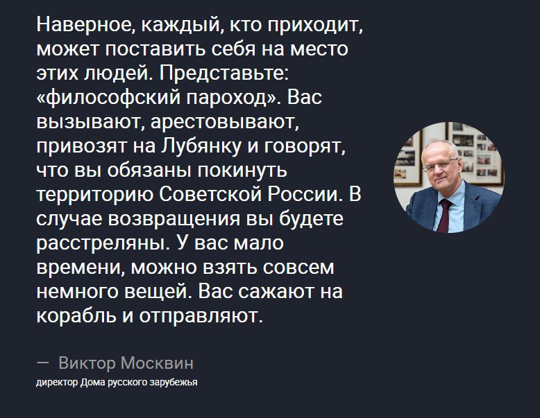 Прочитал смешное интервью с Виктором Москвиным, директором Дома русского зарубежья. Почему смешное? Потому что Дом русского зарубежья собирает артефакты русской эмиграции. Нет, не той, что произошла сейчас, а той что случилась 100 лет назад. А этой самой, сегодняшней, вполне сопоставимой по масштабам, будто и нет. 🤷♂️