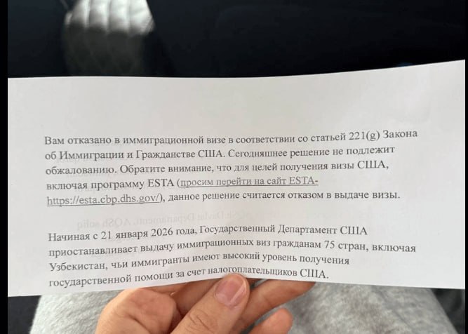 В документе на русском языке, который выдали в американском консульстве в Узбекистане в качестве подтверждения отказа, значится: «Ваша заявка на иммиграционную визу отклонена согласно разделу 221(g) Закона об иммиграции и натурализации США. Данное постановление не может быть оспорено». Подробнее здесь
