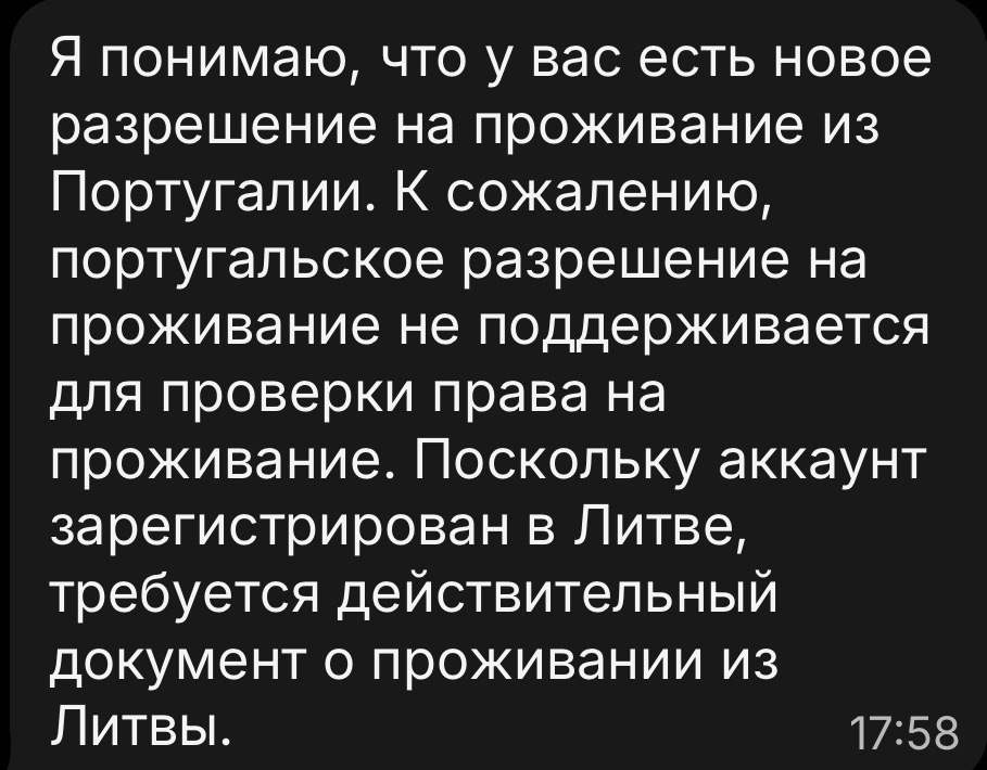 Казалось бы, вот же есть португальский ВНЖ, но он не подходит потому что аккаунт был открыт на литовский ВНЖ. Диалог с учреждением продолжается два месяца. Прогресса нет. Такая простая вещь как переезд человека из страны ЕС в страну ЕС замкнул мозги передовой организации с гордым прозвищем финтех-необанк. А санкции добавили искры.
