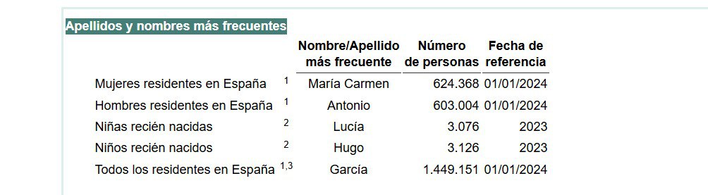 По данным Национального института статистики, в 2024 году у взрослых жителей страны самым популярным женским именем было Мария Кармен. Самое популярное мужское имя - Антонио.