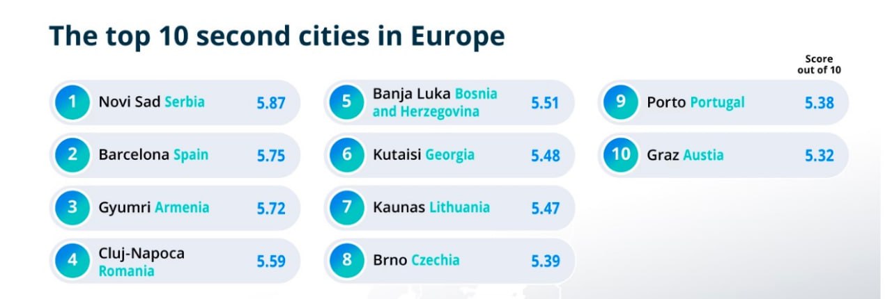 Первое место занял сербский Нови-Сад, третье — Гюмри в Армении, далее после Барселоны расположились Клуж-Напока в Румынии и Баня-Лука в Боснии. Также в ТОП-10 попали Кутаиси (Грузия) и Каунас (Литва).