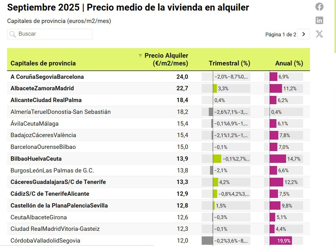 📈 Города с наибольшим годовым ростом (по данным на сентябрь 2025): Сеговия (19,9%), Мадрид (11,2%), Севилья (9,8%), Валенсия (7,8%).