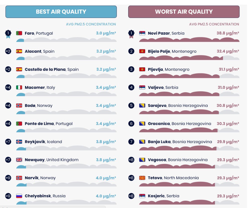Сайт HouseFresh опубликовал рейтинг городов с лучшим качеством воздуха. Для анализа использовались среднегодовые показатели содержания PM2.5 (мелкодисперсных частиц) в 8800 городах с населением свыше 10 тысяч человек.