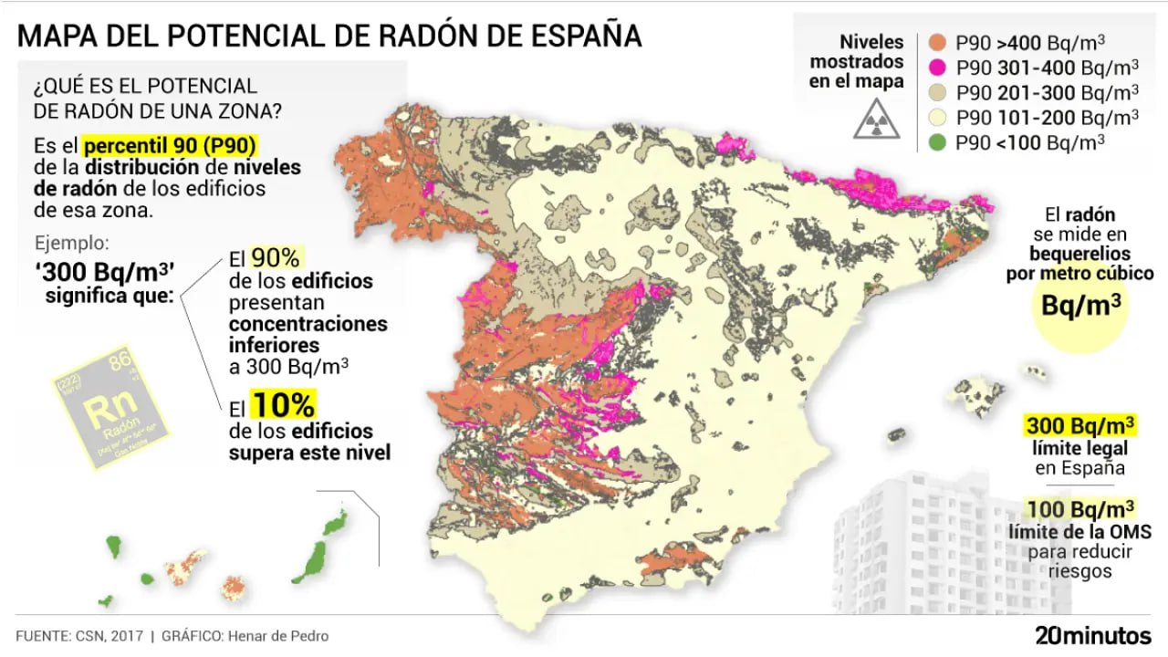 Испания опубликовала обновленную карту радонового загрязнения. Судя по ней, критическая ситуация с радоном складывается в Галисии, Кастилии-и-Леоне, Эстремадуре и северных районах Мадрида (Сьерра-де-Гуадаррама), где состав почвы способствует максимальной концентрации газа.