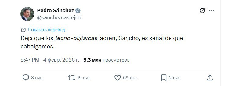 Дуров ранее обратился к пользователям Telegram в Испании, заявив, что планируемые шаги правительства Санчеса по ограничению соцсетей «ставят под угрозу интернет-свободы» и могут якобы превратить страну в государство тотального контроля.