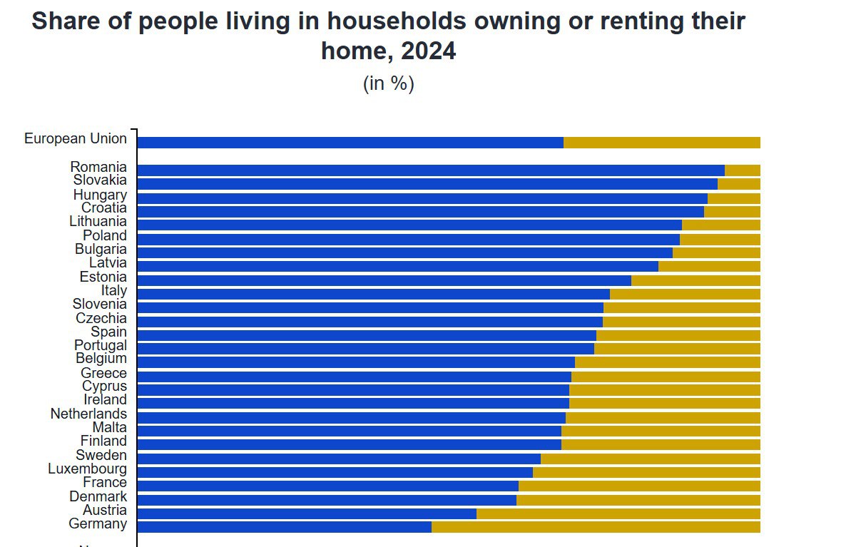 По данным Евростата, Испания опережает средние показатели Евросоюза по количеству владельцев недвижимости. В то время как в среднем по ЕС доля собственников жилья составляет 68%, в Испании этот показатель достигает 75%. Страна традиционно тяготеет к покупке жилья, считая аренду (25%) вынужденной мерой для молодежи или временным вариантом в крупных мегаполисах, таких как Мадрид и Барселона.