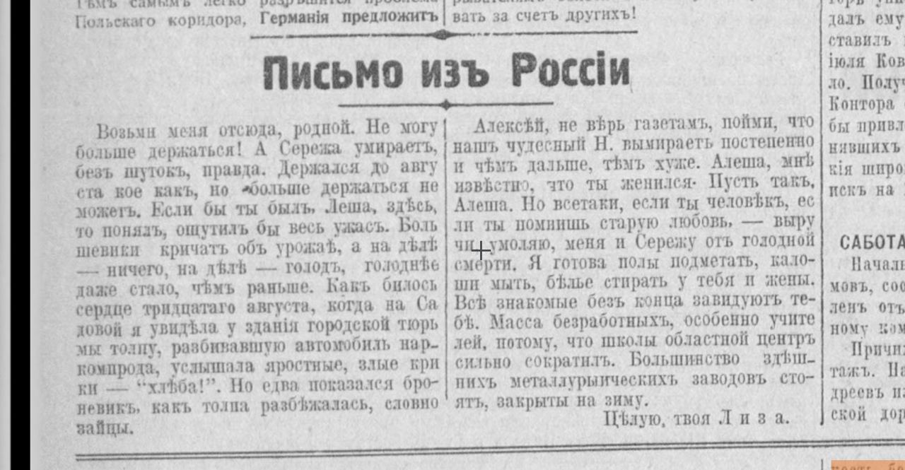 Кольцов усилил эффект от, как ему казалось, удачного розыгрыша для перебивки массового голода в СССР, своим же фельетоном в "Правде", опубликованным через несколько дней после письма в Париж. Торжествуя, он признался, что никакой Лизы нет, письмо белоэмигрантам написал он сам, а чтобы в этом убедиться, надо прочесть первую букву каждого пятого слова письма. Получалось "НАША БЕЛОБАНДИТСКАЯ ГАЗЕТА ПЕЧАТАЕТ ВСЯКУЮ КЛЕВЕТУ ОБ СССР". Раз у Кольцова получилось засунуть на вторую полосу фейк, значит, вся вражеская пресса – фейкньюс, такая логика.