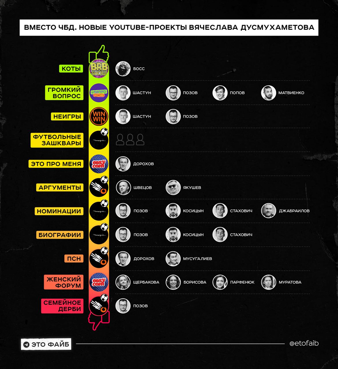 • В 2022 стало модным шутить на тему футбола, несмотря на исключение российских клубов из еврокубков и деградацию уровня РПЛ (началась задолго до этого). На каналах из орбиты Дусмухаметова сейчас выходит аж шесть (!) юмористических шоу про футбол и другой профессиональный спорт. Причем проект со звездными Мусагалиевым и Дороховым пока проигрывает менее известным ведущим.