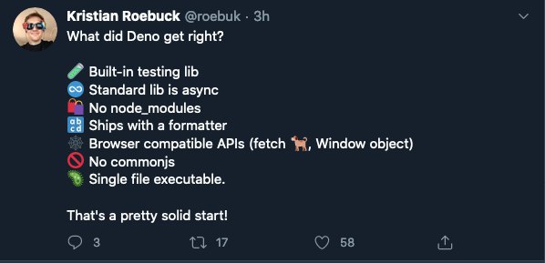 В твиттере радуются, что у NodeJS появился конкурент. Вспоминают yarn, из-за которого npm начал шевелиться и постят что у deno получилось хорошо сразу