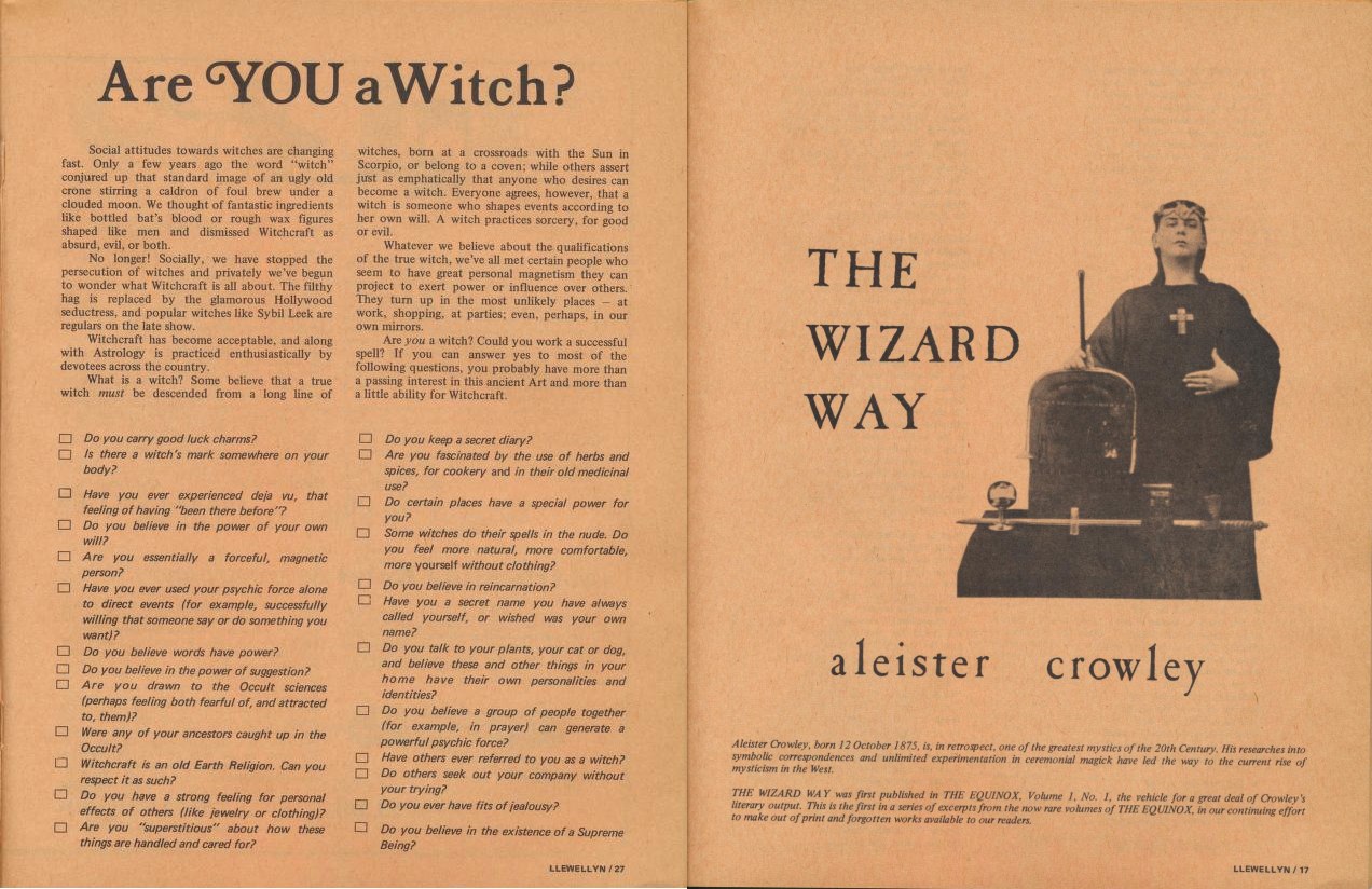 В нашем любимом архиве интернета выложили оккультный журнал и каталог книг Llewellyn от 1971 года. И пока я не прочитал его от корки до корки, успокоиться не смог. Вот, к примеру, отрывок из интервью с Леди Шебой, Американской Королевой Ведьм: