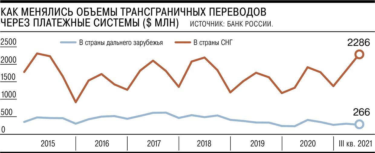 За третий квартал из России в страны СНГ ушло $2,29 млрд через платежные системы. Это рекорд за последние шесть лет. Основные страны назначения — Узбекистан ($1 млрд), Таджикистан ($0,5 млрд) и Киргизия ($0,4 млрд), рост — 22-35%.