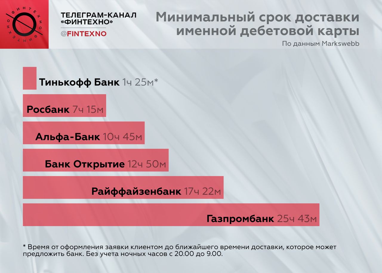 Но запустить доставку мало — важно, чтобы она улучшала клиентский путь и действительно была удобнее и быстрее посещения офиса. По данным Markswebb, минимальная скорость доставки именных дебетовых карт в крупнейших банках — от часа до суток.