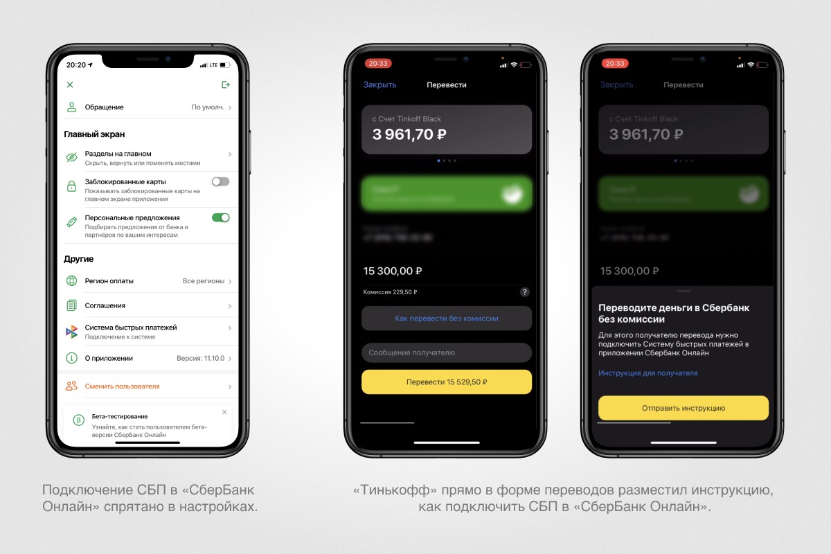 Учитывая простоту и удобство переводов по СБП, 5% это очень мало, и на это есть свои причины. Операции недоступны пользователям приложения по умолчанию, переводы нужно подключить отдельно в настройках приложения, и эту опцию еще нужно найти. Подключение СБП в «Сбербанк Онлайн» настолько сложно найти, что «Тинькофф» сделал инструкцию — она появлялась в форме переводов каждый раз, когда клиент пытался перевести деньги клиенту «СберБанка» без СБП.