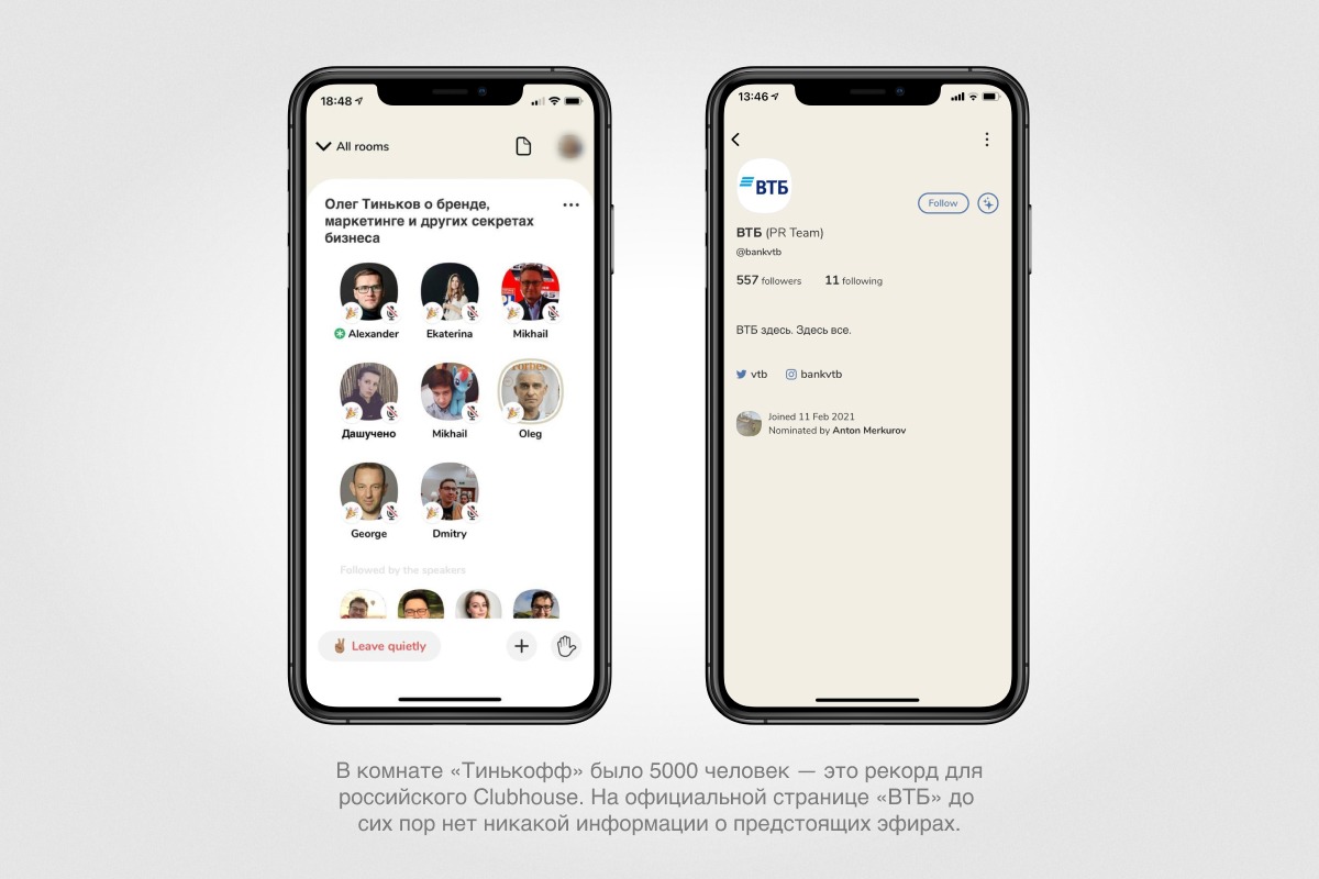 Уже через день, 14 февраля, в Clubhouse прошел первый публичный эфир «Тинькофф Банка», который пока не объявил о создании официального аккаунта. Главным героем стал Олег Тиньков, а лейтмотивом — тема работы в банке. Предприниматель неоднократно акцентировал внимание на том, как здорово работать в «Тинькофф» и что сотрудники — главный ресурс компании.