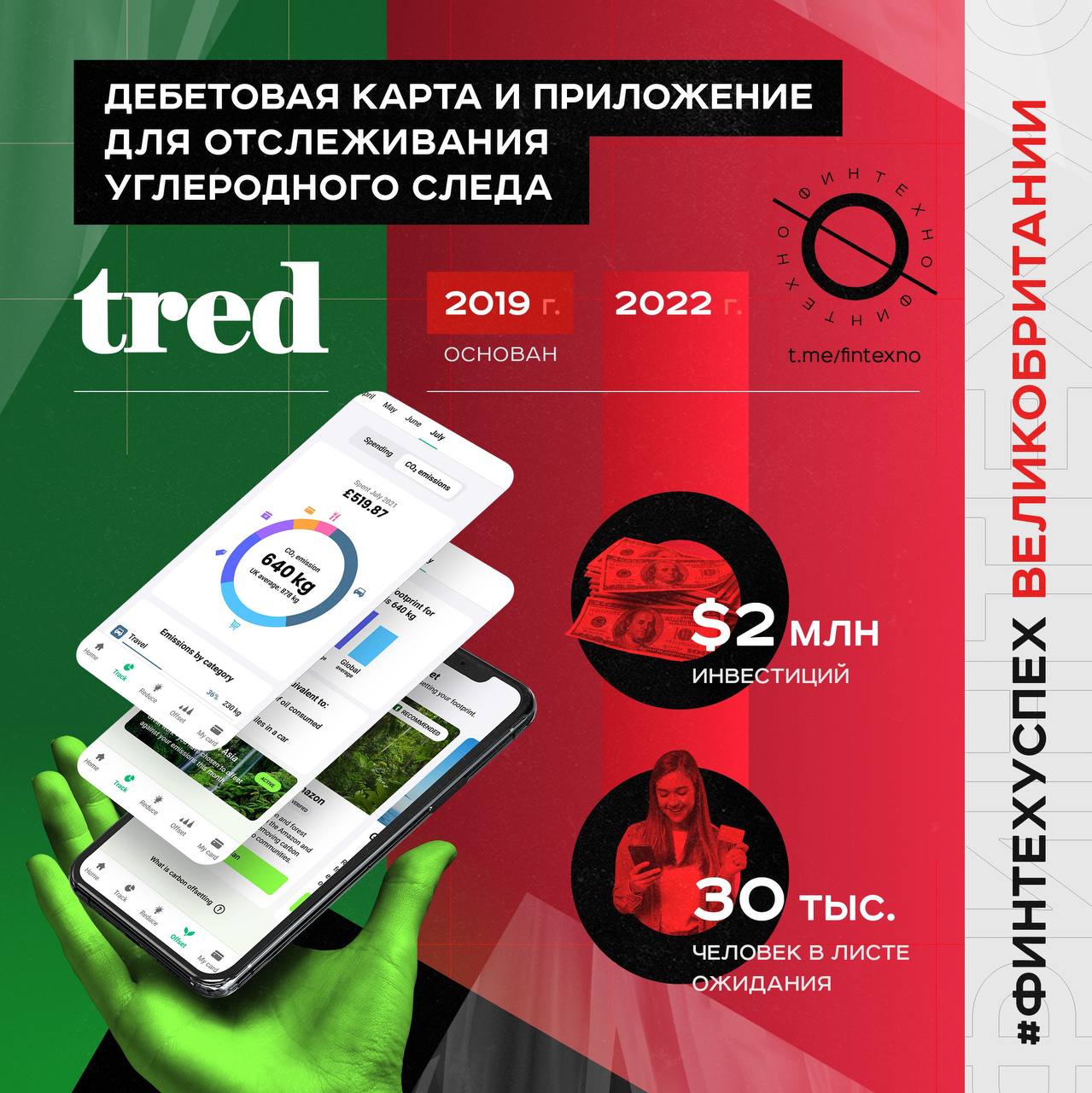 Tred — это дебетовая карта из переработанного пластика и мобильное приложение для отслеживания углеродного следа. Сервис рассчитывает объём выбросов от всех транзакций пользователей и в конце каждого месяца предлагает оплатить подписку. Её размер зависит от количества углерода.