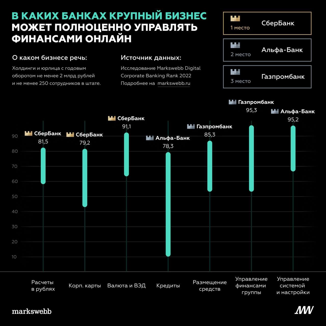 Практически эксклюзив для читателей канала. Собрали инсайты о том, как «Газпромбанк», «Альфа-Банк» и «Сбер» развивают цифровые сервисы для крупного бизнеса с оборотом больше 2 млрд рублей. Именно эти банки лидируют на рынке по качеству платформ — такой вывод сделали коллеги из Markswebb по результатам исследования Digital Corporate Banking Rank 2022.