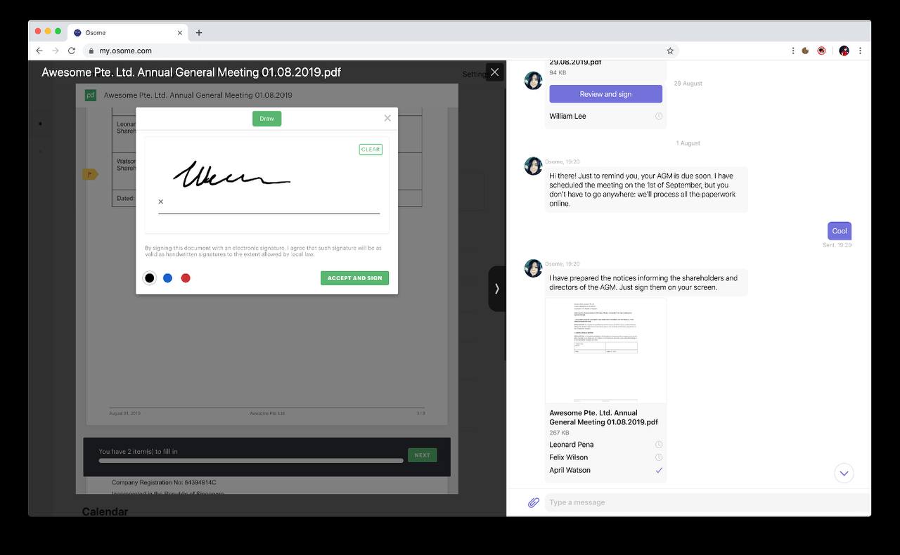 Также сервис предлагает услуги корпоративного секретаря, регистрацию бизнеса, помощь с соблюдением нормативных требований и налогообложением. Платформа использует технологию машинного обучения для автоматизации рутинных задач предпринимателей — классифицирует, маркирует и хранит документы, создает управленческие отчеты и налоговые декларации, вовремя подает документы.
