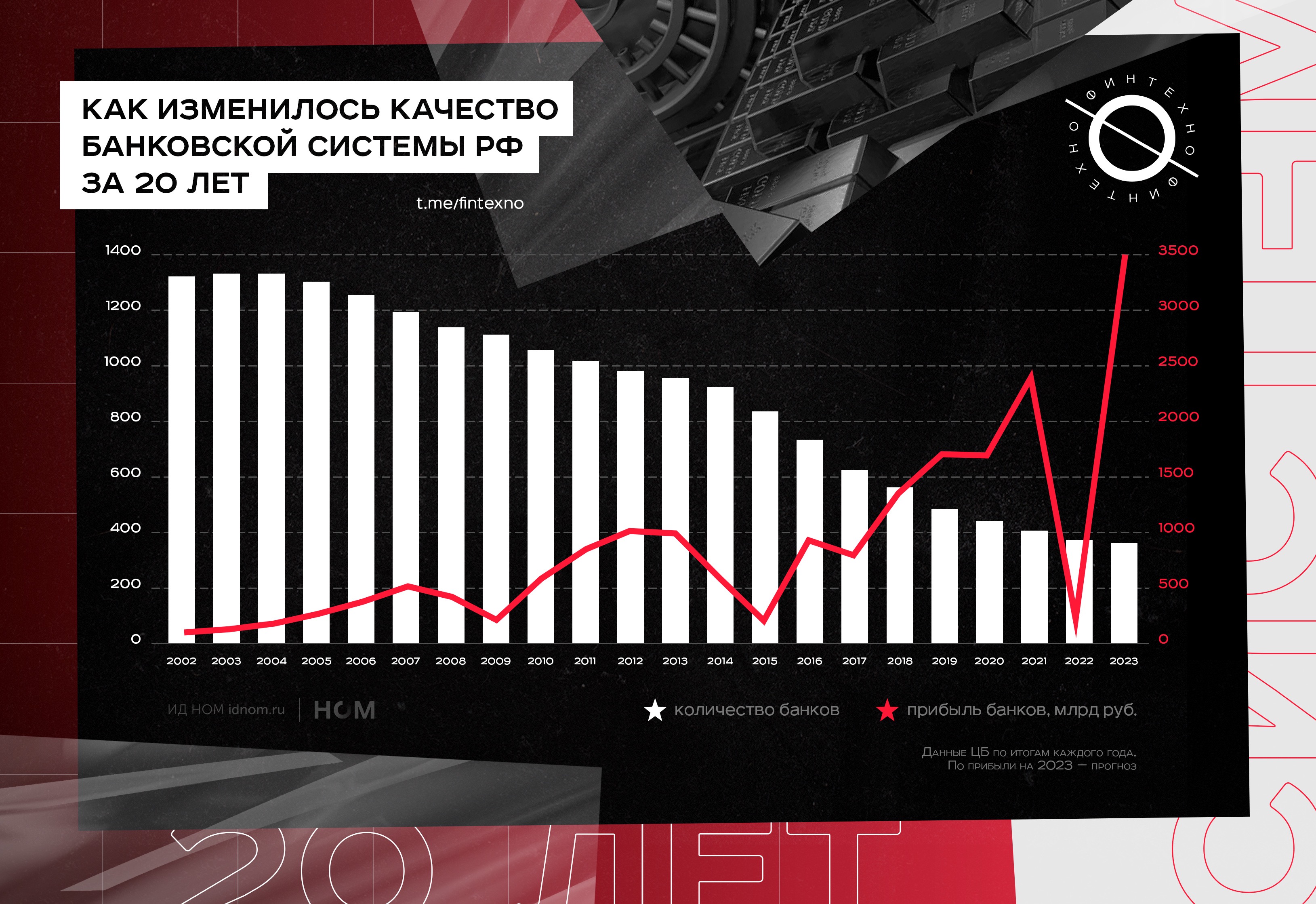 Самый яркий пример — вызовы 2022 года, по итогам которого прибыль банковского сектора РФ рухнула до 203 млрд рублей, а прогнозный результат 2023 года — 3,4 трлн (оценка ЦБ).