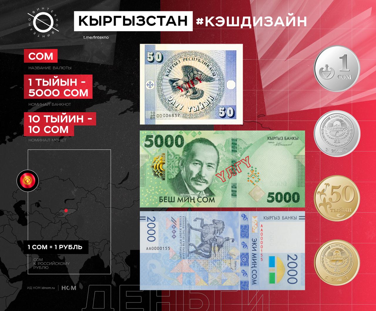 Кыргызский сом — валюта, дизайн которой посвящён великим людям, которые повлияли на историю страны: на лицевой стороне каждой банкноты изображается портрет человека, а на оборотной — либо тематически связанное архитектурное сооружение, либо исторические памятники, либо природные достопримечательности страны.
